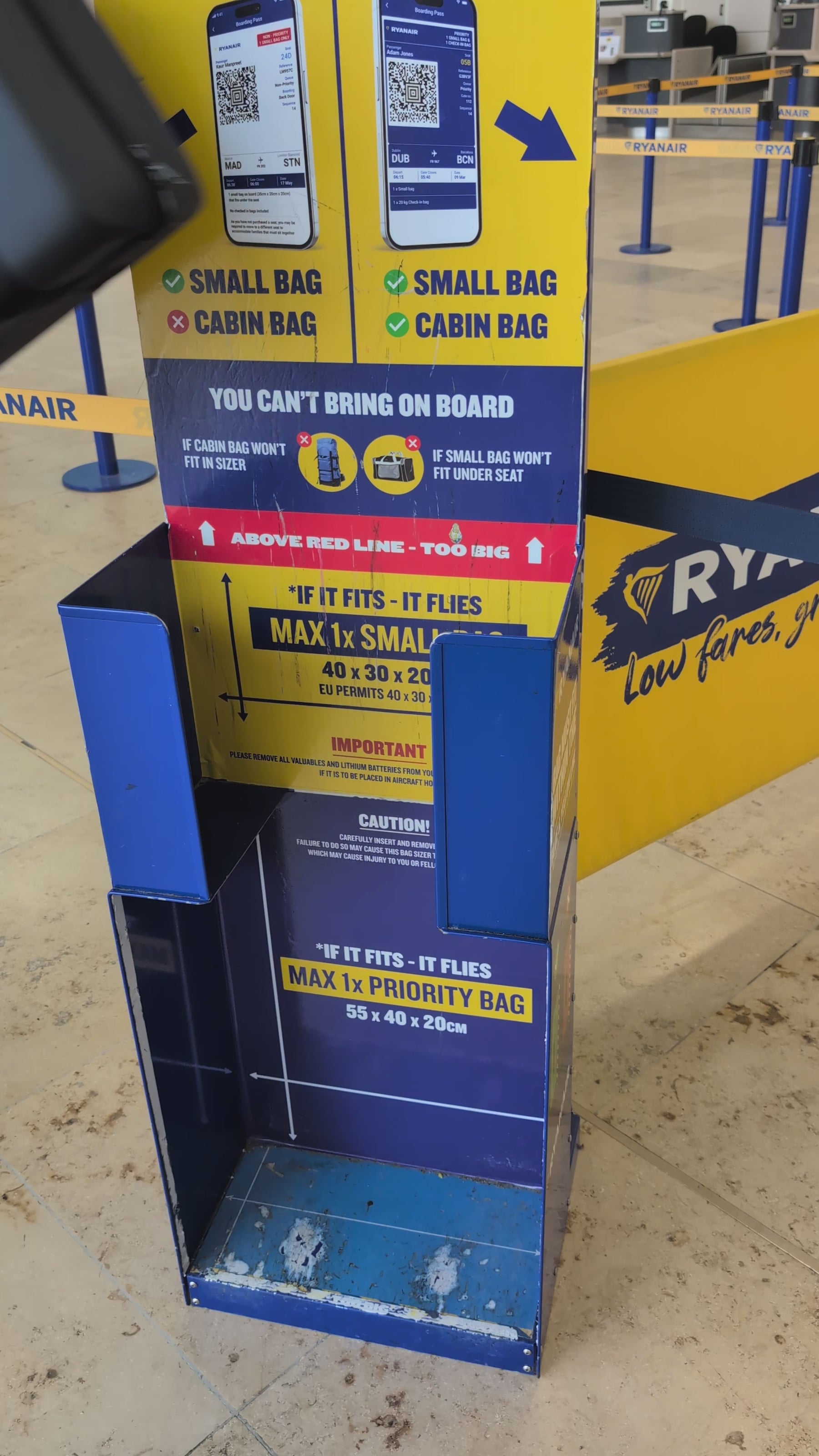A: No, this 40x30x20 cm bag fits Ryanair's free under-seat allowance. If you require a larger carry on bag or suitcase (maximum 55x40x20 cm) you will need to pay for priority boarding